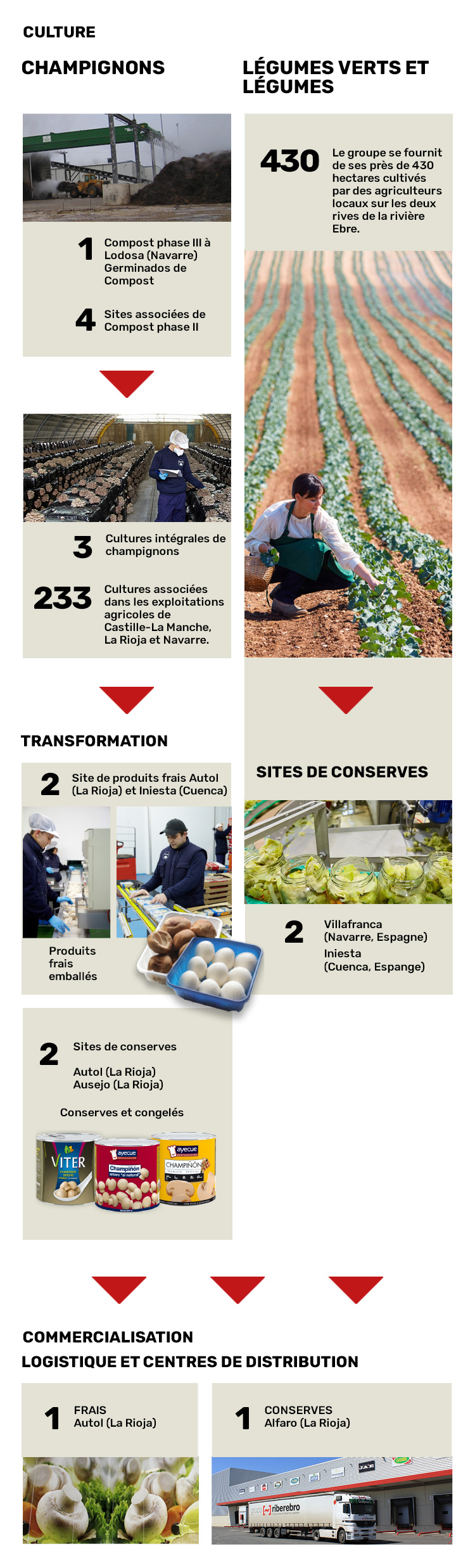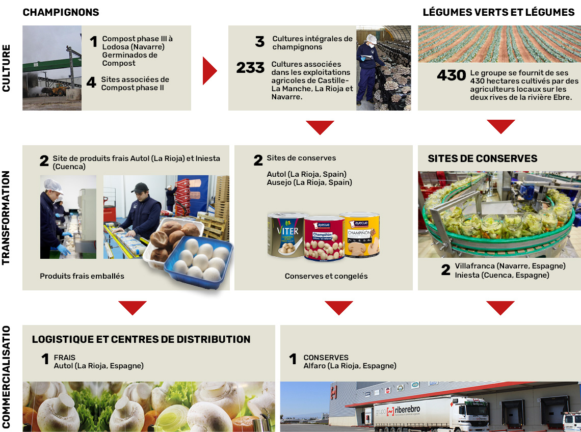 Riberebro coordonne le travail de 8 centres de production en Espagne, avec une capacité de transformation de plus de 150 000 tonnes de produits frais par année. Leur structure intègre toute la chaîne de valeur des champignons de Paris: compost, cultures, transformation et vente; ainsi que la production et la commercialisation de légumes verts et légumes secs. Le Groupe produit des conserves de légumes, dans des bocaux et dans des packagings en carton Tetra Recart ®. Riberebro contrôle la traçabilité depuis le semis au produit final, avec un système informatisé. Garantissez la sécurité alimentaire et utilisez la technologie la plus avancée dans les processus d’examen, sélection des matières premières et de transformation. Le Groupe est la seule entreprise espagnole à utiliser toute la chaîne de valeur intégré: compost, cultures, transformation et vente. Riberebro est un leader de la qualité, de la sécurité alimentaire et de la logistique.